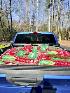 Arrange the mulch bags in your truck like a pro. I stacked and shuffled them until I had a perfect, red-and-green load ready to roll home.